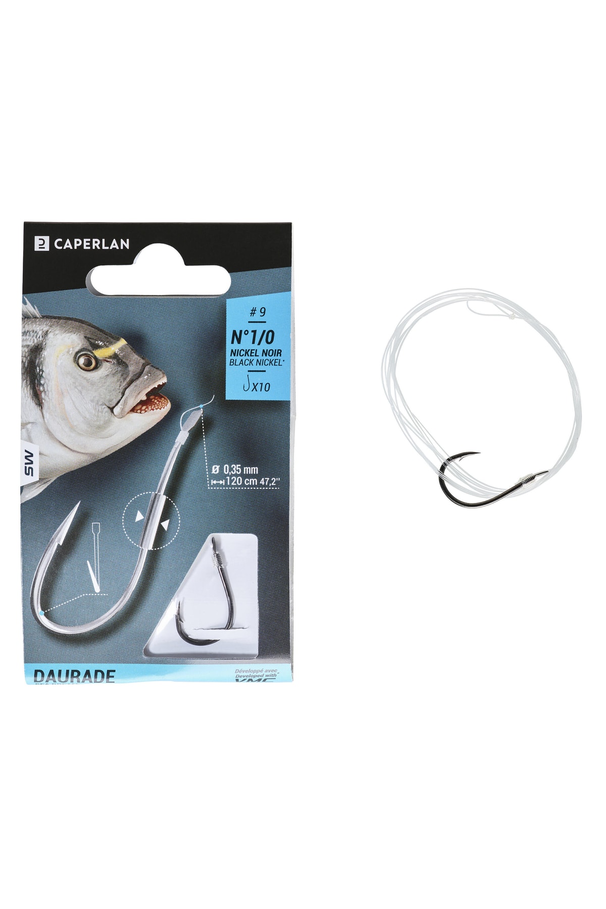 مزایای محصول سهولت نصب / برداشتن: به لطف حلقه در انتهای خال، سوزن به راحتی متصل می شود. دستگیره: به لطف شکل خاص سوزن ها، طعمه ها را می توان به راحتی وصل کرد. ماندگاری: در برابر نیش ماهی از خانواده باسن مقاوم است. مفهوم محصول و فناوری ترکیب محصول: ساختار 100% فولاد پشتیبانی 100% پوشش پلی آمید 100% نیکل برنج توصیه ذخیره سازی: دور از رطوبت نگهداری شود. اطلاعات فنی جزء: 10 قلاب ماهیگیری آماده مخصوص ماهیگیری با ماهی. هر سوزن به یک خال 120 سانتی متری متصل می شود. اندازه موجود n°1/0 سوزن, 35/100 shackle n°2, 30/100 shackle n°4, 28/100 shackle n°6, 26/100 shackle n°8, 24/100 chackle
